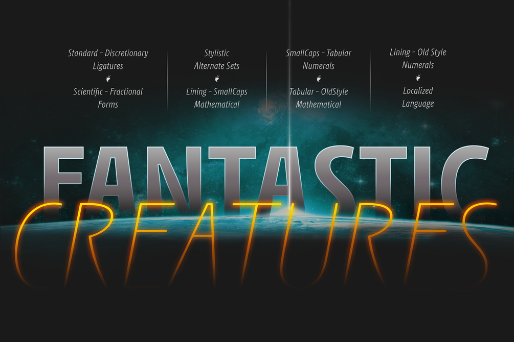 Including standard and discretionary ligatures; contextual alternates; lining, old style, smallcaps and tabular numerals; scientific and fractional forms; lining, smallcaps, tabular and oldstyle mathematical and currency symbols; localized language customization for azeri, german, dutch, polish, catalan, romanian, moldavian, turkish, and much more.
