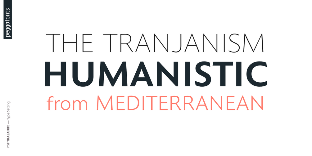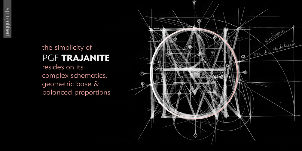 “PGF-Trajanite” is a simple Roman typeface, with capital letters inspired on classical Trajan schemmas such regular square and circle, simple and double root five, early ideas based on the golden ratio, while lowercase have more organic but yet balanced proportions with short ascenders/descenders stems allowing more air to flow between textlines, both (capitals and lowercases) optically adjusted to deliver a better reading experience.